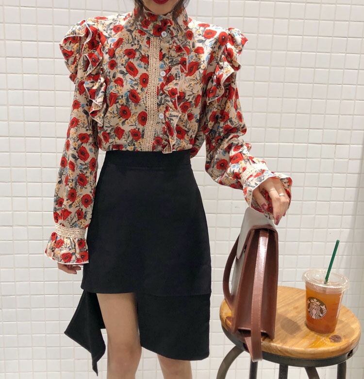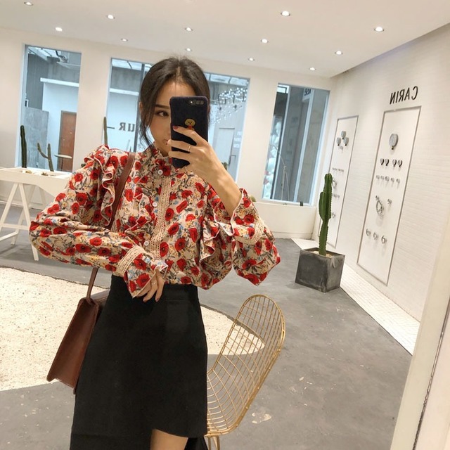 【送料無料】レディース ブラウス スタンドカラー フリル レース 花柄 フラワー 長袖 総柄 大人可愛い ママコーデ ママファッション 韓国 オルチャンファッション 人気 トレンド 新作 20代 30代 40代 きれいめ レトロ シンプル お出かけ デート おしゃれ 通勤 通学 オフィス OL デイリー 普段着 ラフ カジュアル フェミニン シック ゆったり 体型カバー 着痩せ 着回し インスタ映え 春 秋 冬 CO3019