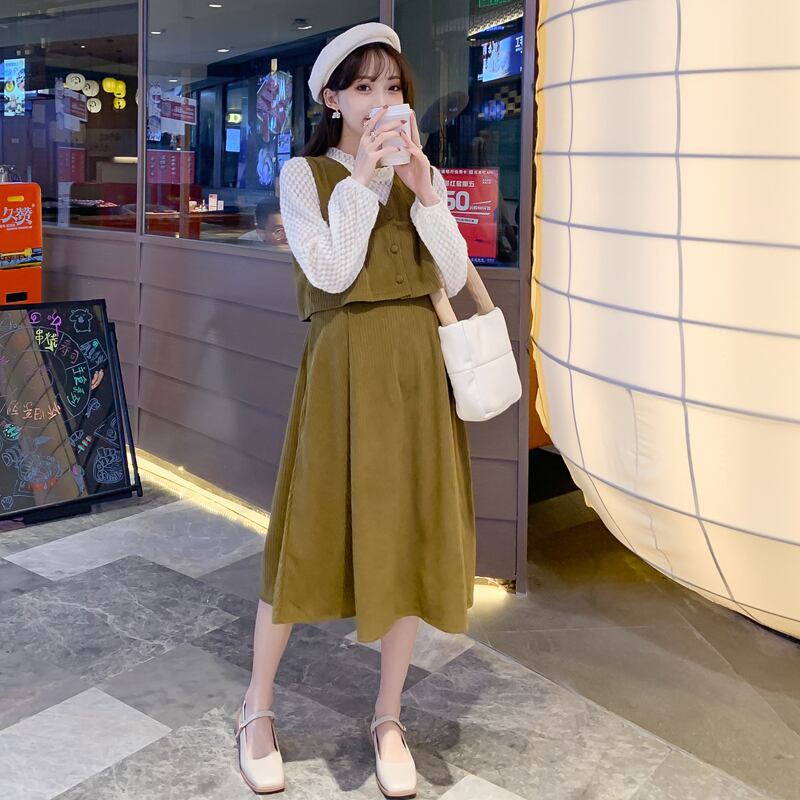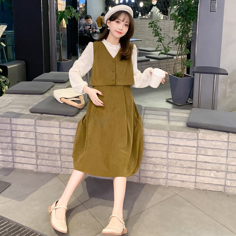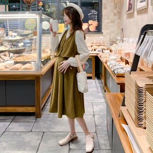 ベストとワンピースをレイヤードしたような優しい印象のワンピース。