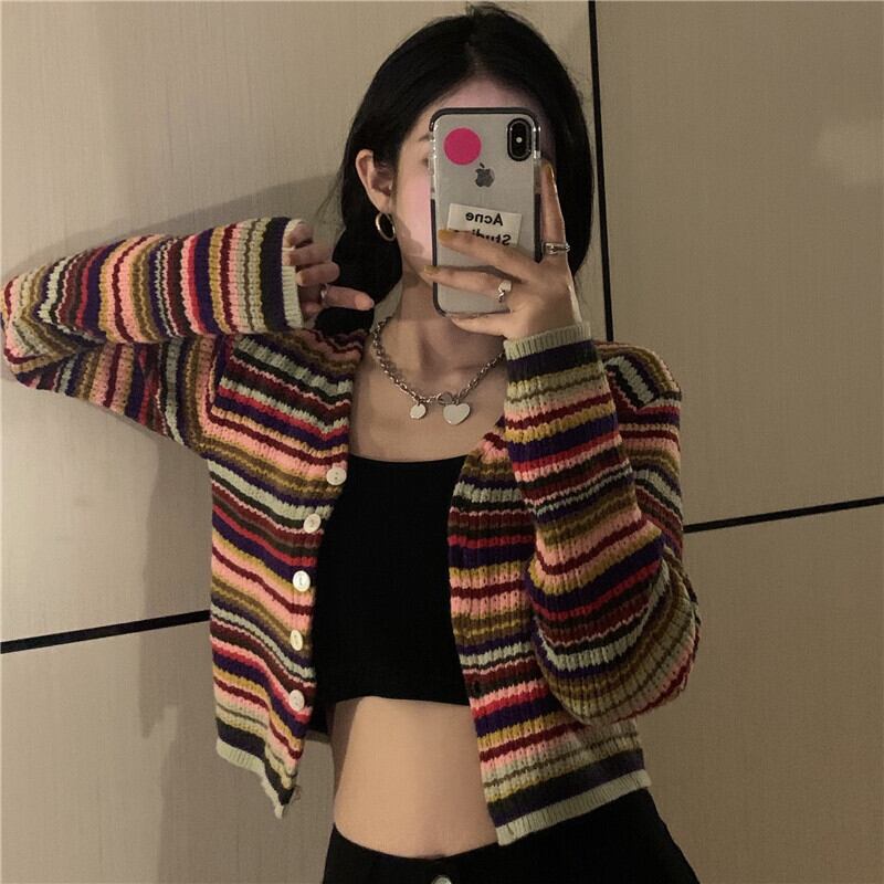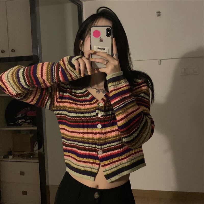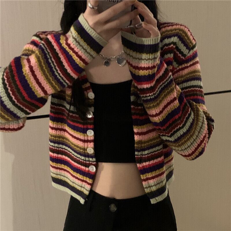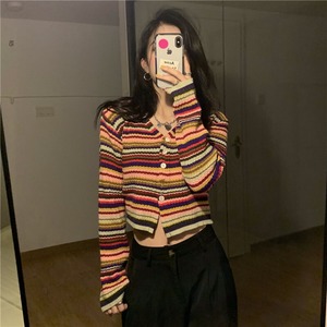 【送料無料】レディース カーディガン ニット マルチボーダー Vネック ショート丈 クロップド丈 長袖 大人可愛い ママコーデ ママファッション 韓国 オルチャンファッション 人気 トレンド 新作 20代 30代 40代 きれいめ レトロ シンプル お出かけ デート おしゃれ 通勤 通学 オフィス OL デイリー 普段着 ラフ カジュアル フェミニン シック ゆったり 体型カバー 着痩せ 着回し インスタ映え 秋 冬 CO3165