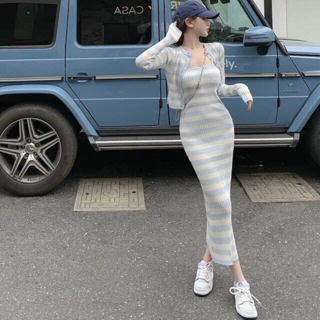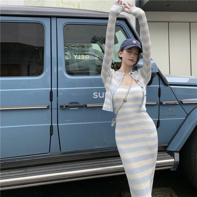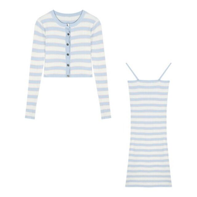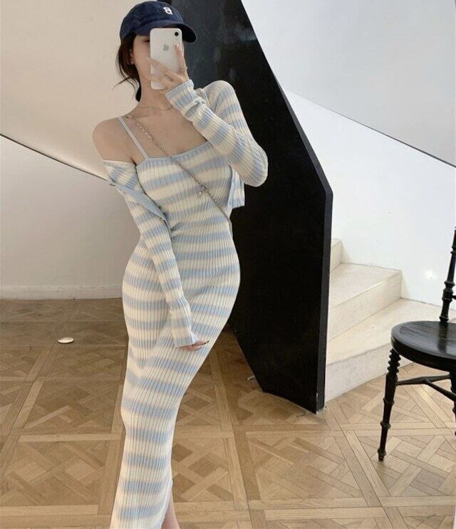 【送料無料】レディース セットアップ ワンピース カーディガン 2点セット レイヤード 重ね着 ボーダー 長袖 ショート丈 前ボタン キャミワンピース ロングワンピース ロング丈 ルームウェア 大人可愛い ママコーデ ママファッション 韓国 オルチャンファッション 人気 トレンド 新作 20代 30代 40代 きれいめ レトロ シンプル お出かけ デート おしゃれ 通勤 通学 オフィス OL デイリー 普段着 ラフ カジュアル フェミニン 着痩せ 着回し インスタ映え 春 秋 CO3177