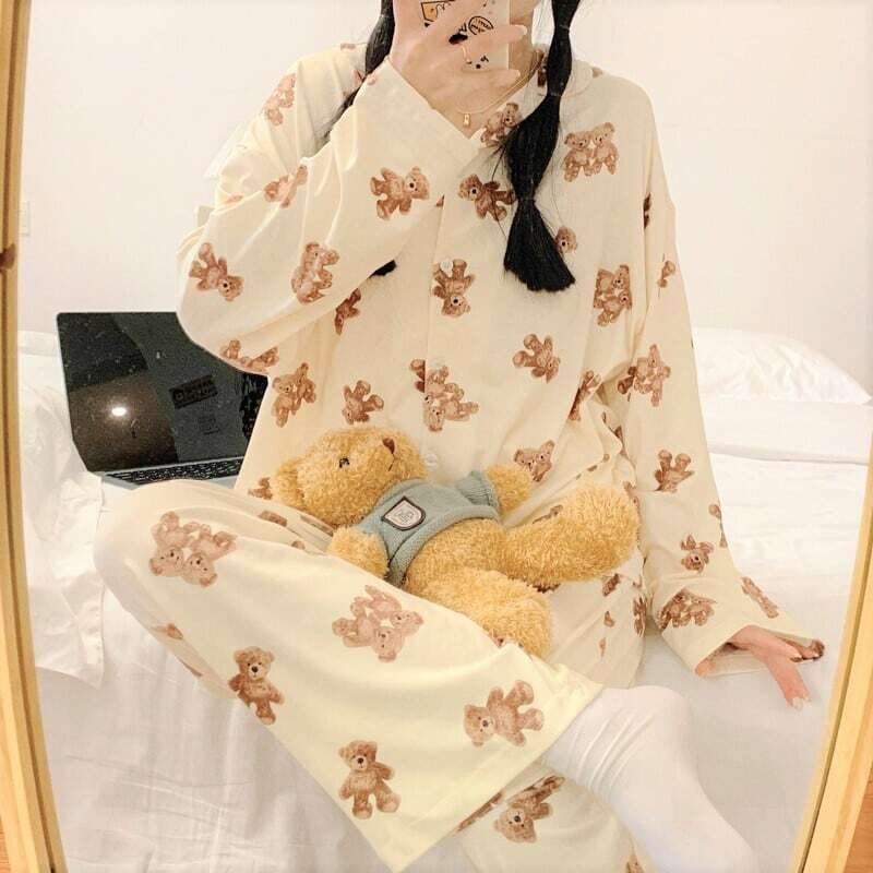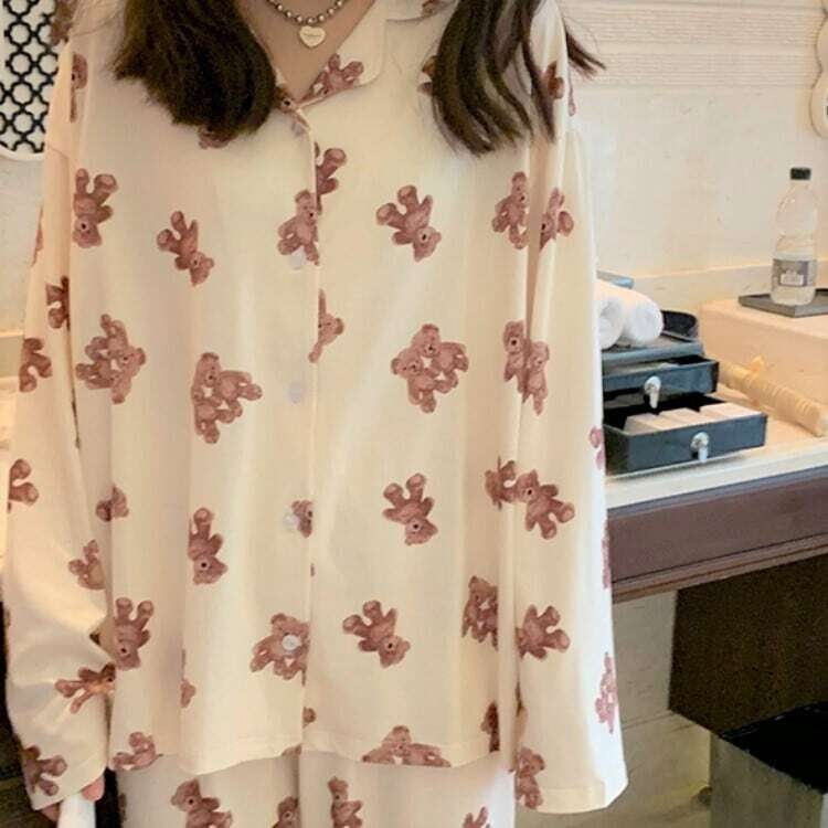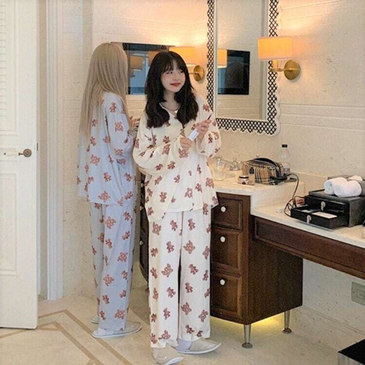【送料無料】レディース パジャマ クマ サテン生地 テディベア 総柄 開襟 お揃い 大人可愛い ママコーデ ママファッション 韓国 オルチャンファッション 人気 トレンド 新作 20代 30代 40代 ルームウェア セットアップ 2点セット 2ピース ツーピース 上下セット 部屋着 寝巻き おうち時間 家着 ステイホーム おしゃれ カジュアル 可愛い キュート リラックス お泊り 旅行 シンプル 無地 ゆったり デイリー 普段使い 秋 春 夏 CO3038