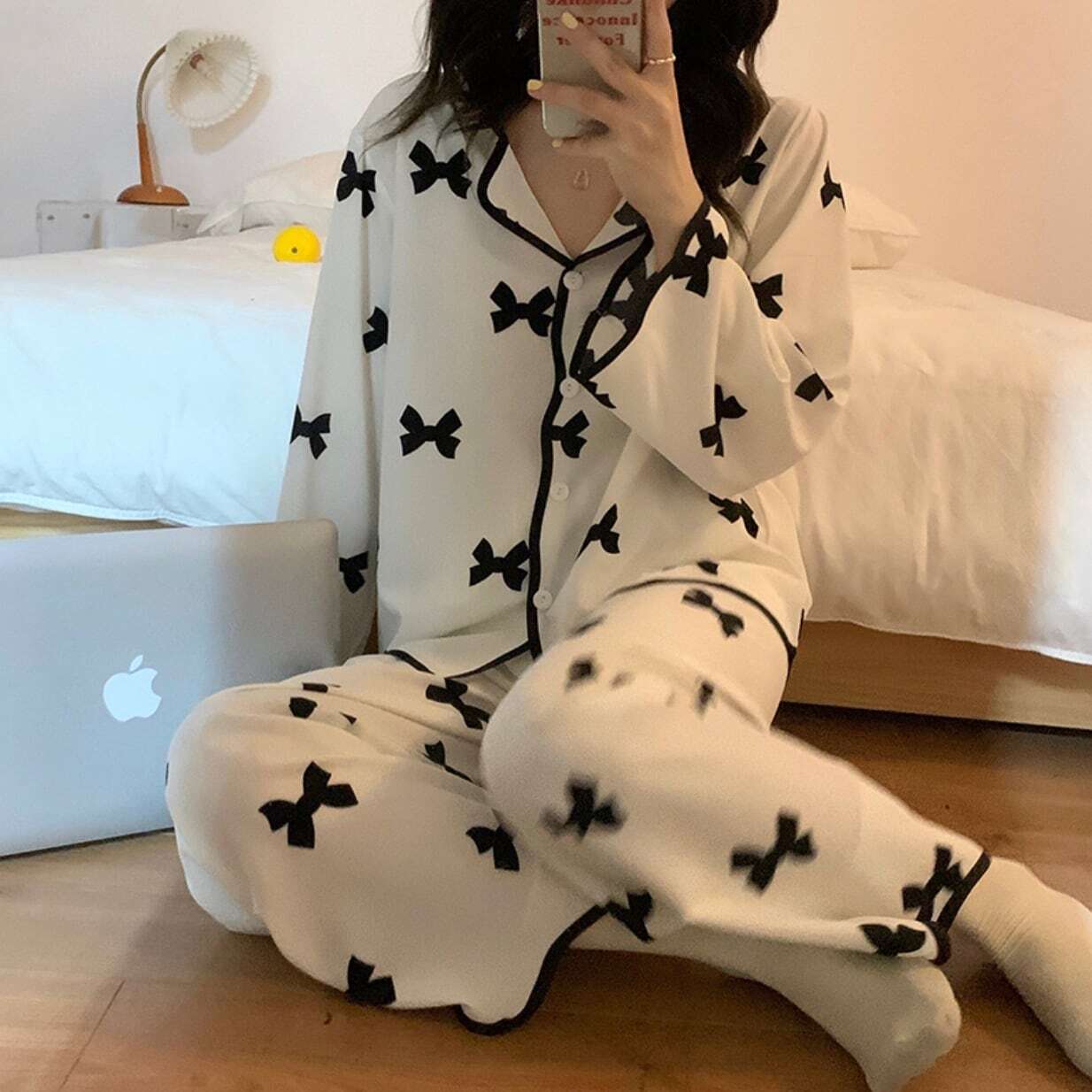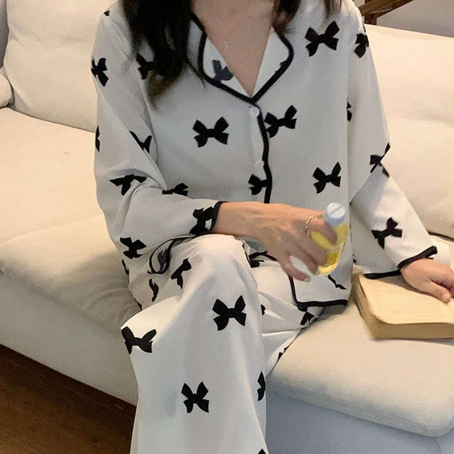 【送料無料】レディース パジャマ リボン 総柄 パイピング 開襟 モノトーン リラックスウェア 大人可愛い ママコーデ ママファッション 韓国 オルチャンファッション 人気 トレンド 新作 20代 30代 40代 ルームウェア セットアップ 2点セット 2ピース ツーピース 上下セット 部屋着 寝巻き おうち時間 家着 ステイホーム おしゃれ カジュアル 可愛い キュート リラックス お泊り 旅行 シンプル 無地 ゆったり デイリー 普段使い 秋 春 夏 CO3040