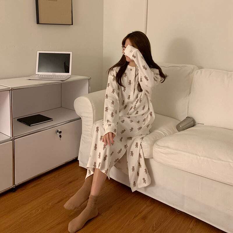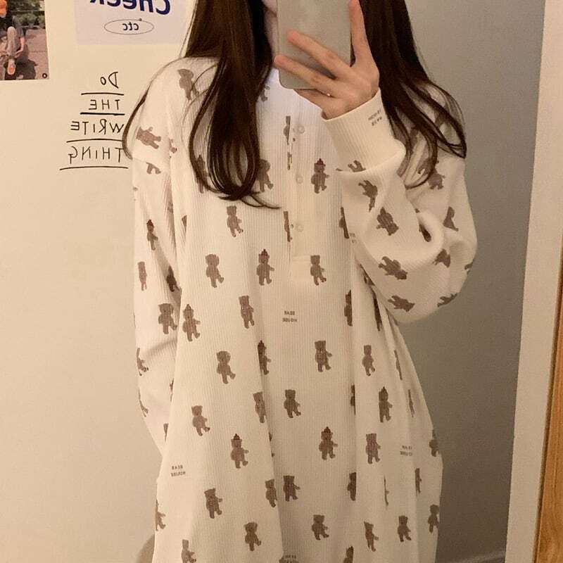 【送料無料】レディース パジャマ ナイトウェア ワンピース 可愛い くまさん ガーリー くま柄 長袖 サイドスリット ハーフボタン 大人可愛い ママコーデ ママファッション 韓国 オルチャンファッション 人気 トレンド 新作 20代 30代 40代 ルームウェア 部屋着 寝巻き おうち時間 家着 ステイホーム おしゃれ カジュアル 可愛い キュート リラックス お泊り 旅行 シンプル 無地 ゆったり デイリー 普段使い 秋 春 夏 CO3054