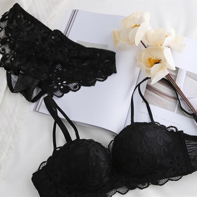 フラワー刺しゅうをあしらった、可愛らしいブラ&ショーツセット。