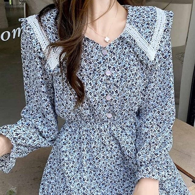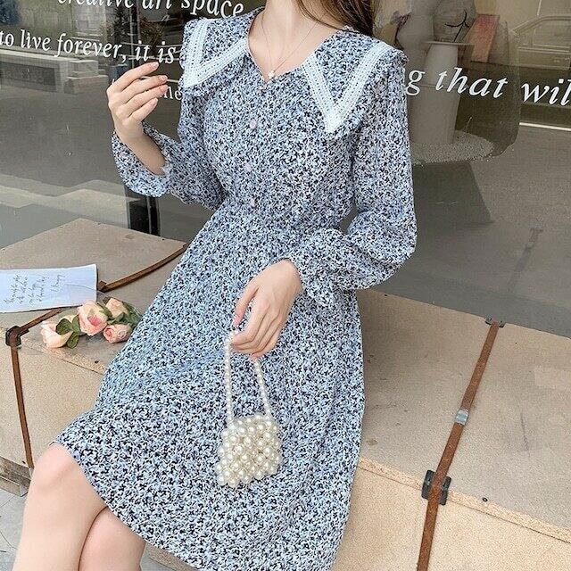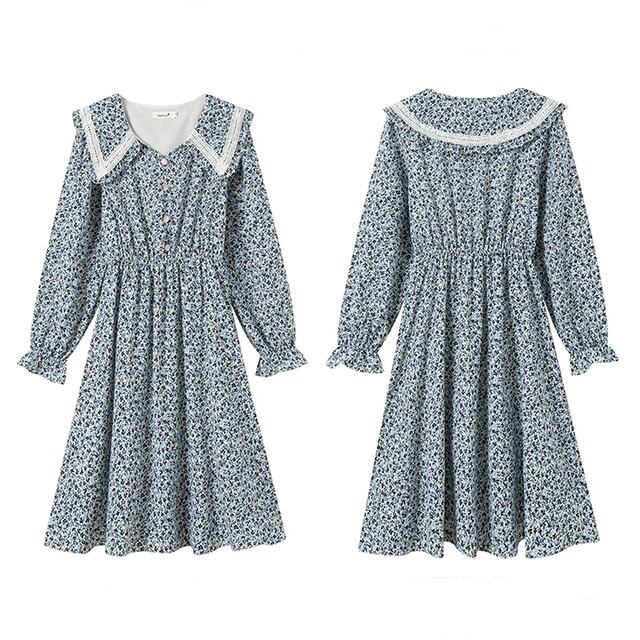 【送料無料】レディース ワンピース 花柄 小花柄 ビッグカラー レース 長袖 デザインボタン ビジューボタン ミディアム丈 フレア Aライン ハイウエスト 大人可愛い ママコーデ ママファッション 韓国 オルチャンファッション 人気 トレンド 新作 20代 30代 40代 きれいめ レトロ シンプル お出かけ デート おしゃれ 通勤 通学 オフィス OL デイリー 普段着 ラフ カジュアル フェミニン シック ゆったり 体型カバー 着痩せ 着回し インスタ映え 春 秋 CO3481