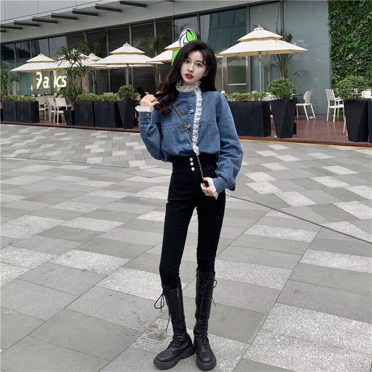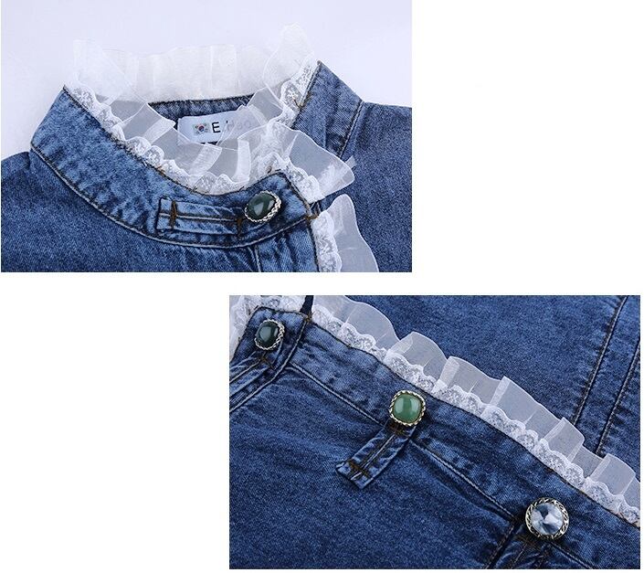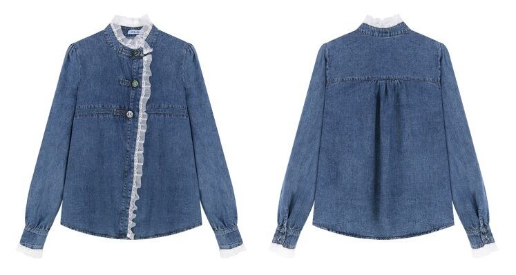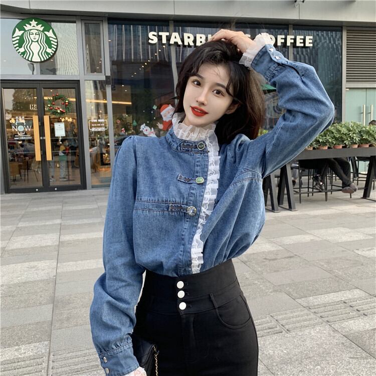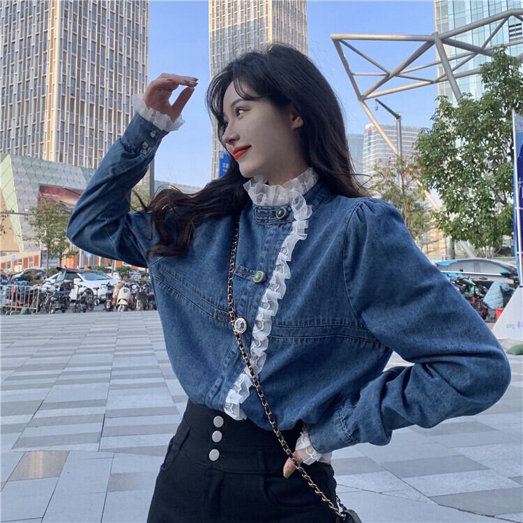 【送料無料】レディース ブラウス シャツ デニム 袖コンシャス レース スタンドカラー ビジューボタン 長袖 大人可愛い ママコーデ ママファッション 韓国 オルチャンファッション 人気 トレンド 新作 20代 30代 40代 きれいめ レトロ シンプル お出かけ デート おしゃれ 通勤 通学 オフィス OL デイリー 普段着 ラフ カジュアル フェミニン シック ゆったり 体型カバー 着痩せ 着回し インスタ映え 春 秋 冬 CO3510
