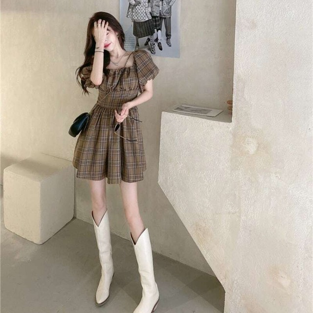 【送料無料】レディース 2カラー ワンピース 半袖 パフスリーブ ウエストマーク ミニワンピース ミニ丈 チェック柄 無地 フレア 切り替え スクエアネック 大人可愛い ママコーデ ママファッション 韓国 オルチャンファッション 人気 トレンド 新作 20代 30代 40代 きれいめ レトロ シンプル お出かけ デート おしゃれ 通勤 通学 オフィス OL デイリー 普段着 ラフ カジュアル フェミニン シック ゆったり 体型カバー 着痩せ 着回し インスタ映え 春 夏 秋 CO3514