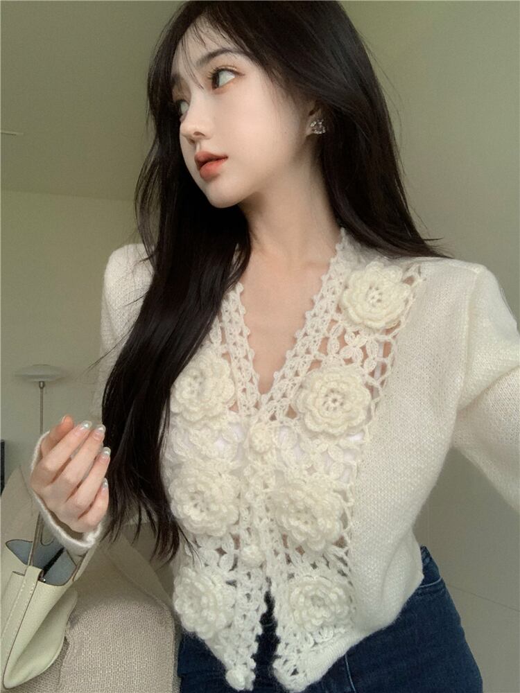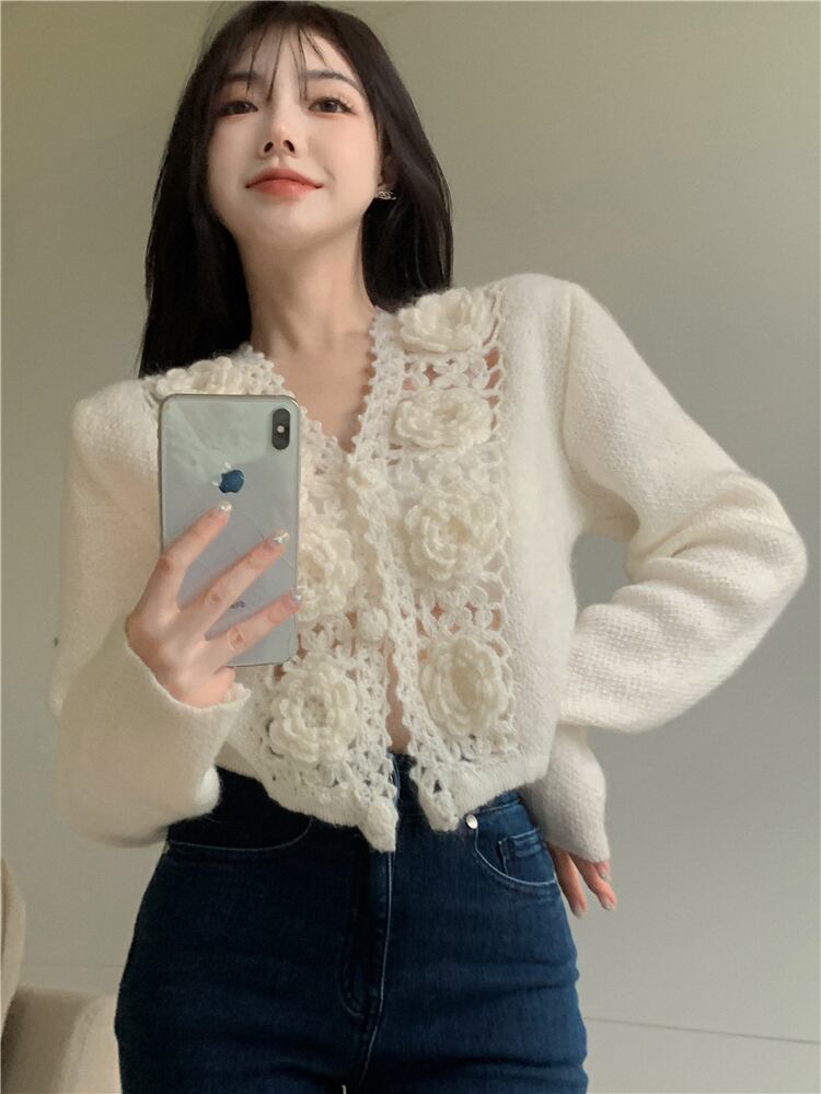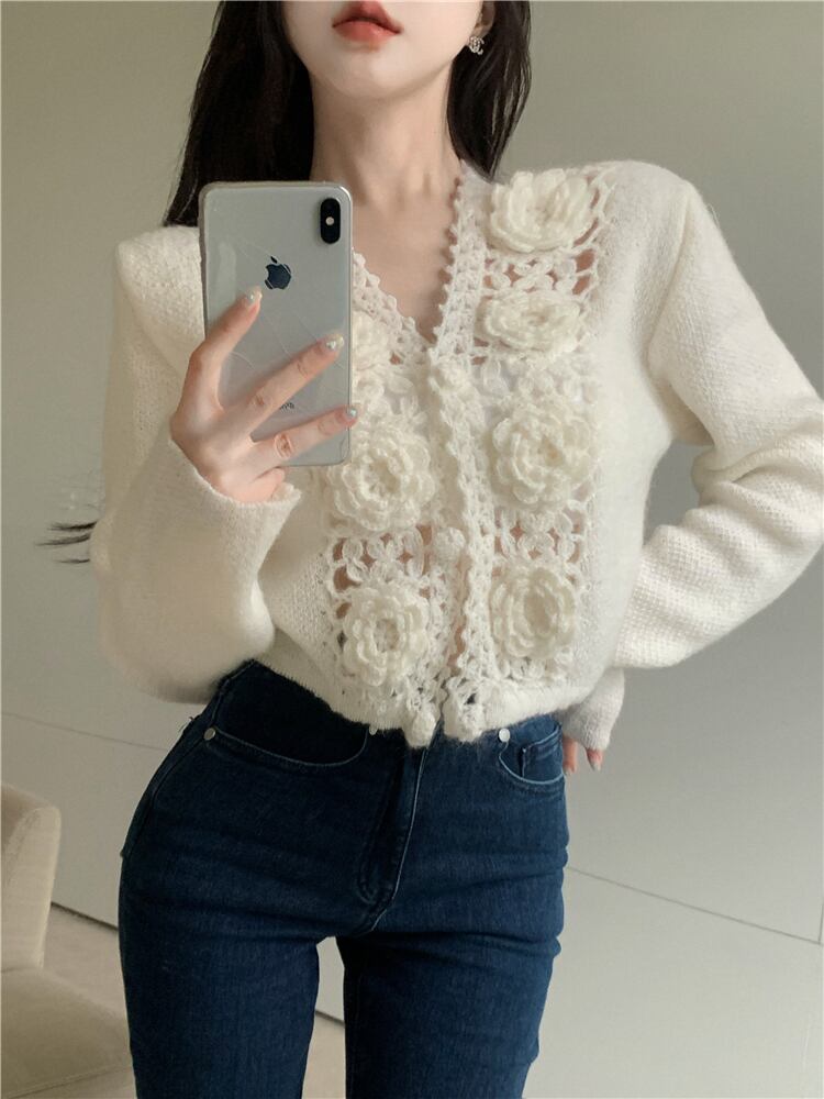 【送料無料】レディース カーディガン ニット 立体花 フラワーモチーフ レース編み 長袖 アイボリー 大人可愛い ママコーデ ママファッション 韓国 オルチャンファッション 人気 トレンド 新作 20代 30代 40代 きれいめ レトロ シンプル お出かけ デート おしゃれ 通勤 通学 オフィス OL デイリー 普段着 ラフ カジュアル フェミニン シック ゆったり 体型カバー 着痩せ 着回し インスタ映え 春 秋 冬 CO3520