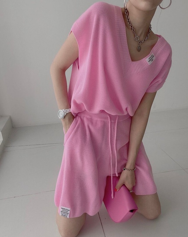 【送料無料】レディース 4カラー セットアップ トップス ニット生地 Vネック 半袖 リブ ショートパンツ ワイド 上下セット 大人可愛い ママコーデ ママファッション 韓国 オルチャンファッション 人気 トレンド 新作 20代 30代 40代 きれいめ レトロ シンプル お出かけ デート おしゃれ 通勤 通学 オフィス OL デイリー 普段着 ラフ カジュアル フェミニン シック ゆったり 体型カバー 着痩せ 着回し インスタ映え 春 夏 CO3540