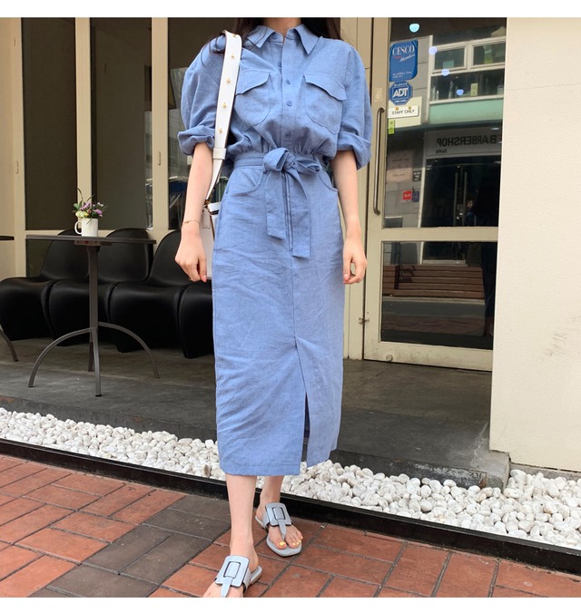 Iラインになりがちなシャツワンピースもウエストリボンでメリハリが出ます。