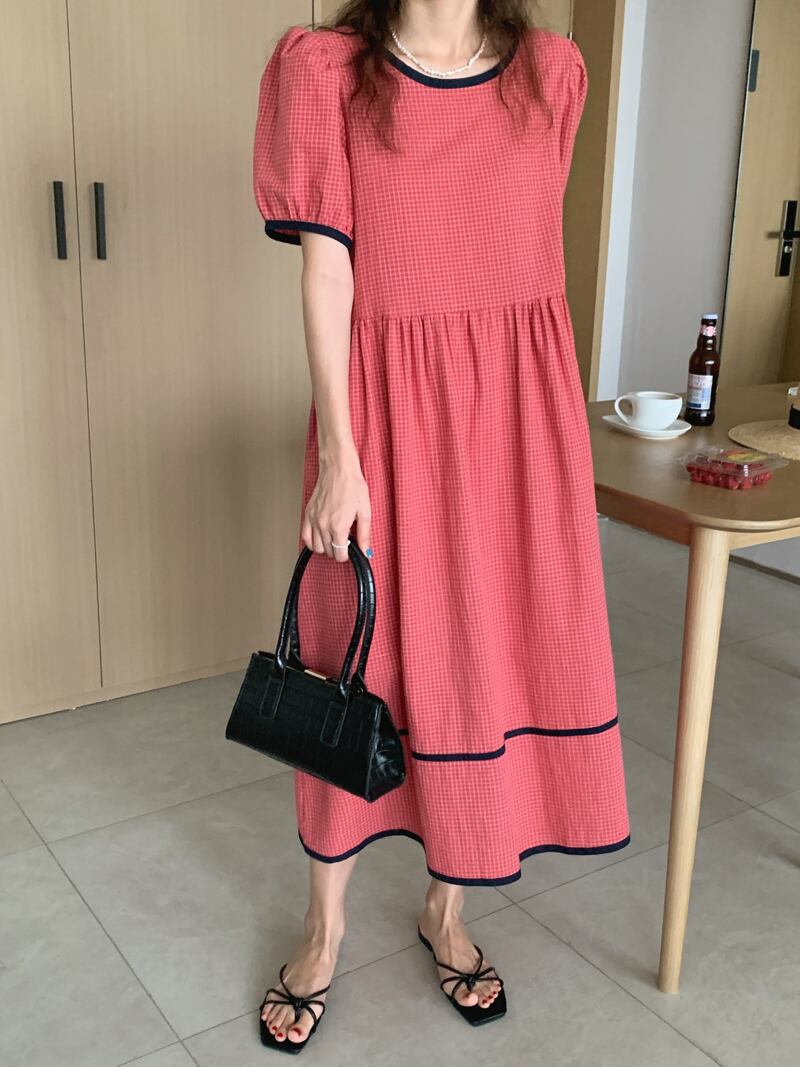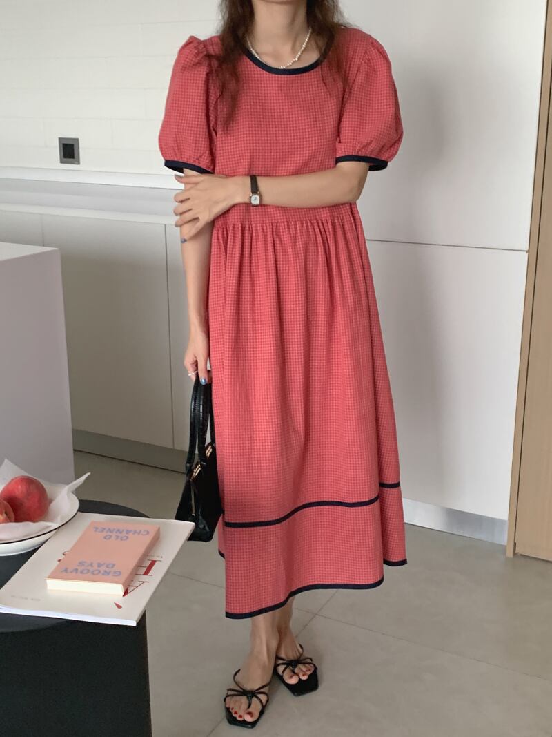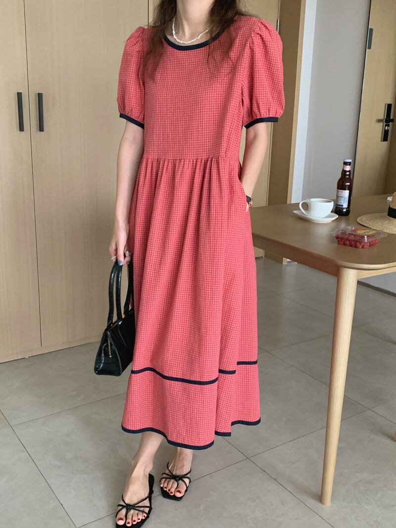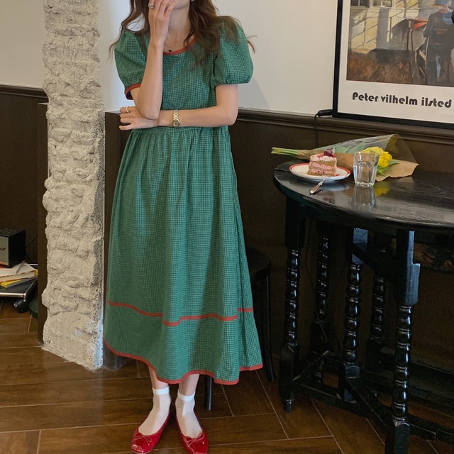 【送料無料】レディース 2カラー ワンピース 半袖 パフスリーブ チェック柄 パイピング ロングワンピース ハイウエスト 切り替え 大人可愛い ママコーデ ママファッション 韓国 オルチャンファッション 人気 トレンド 新作 20代 30代 40代 きれいめ レトロ シンプル お出かけ デート おしゃれ 通勤 通学 オフィス OL デイリー 普段着 ラフ カジュアル フェミニン シック ゆったり 体型カバー 着痩せ 着回し インスタ映え 春 夏 CO3551