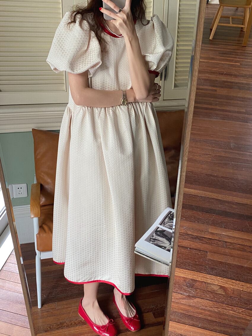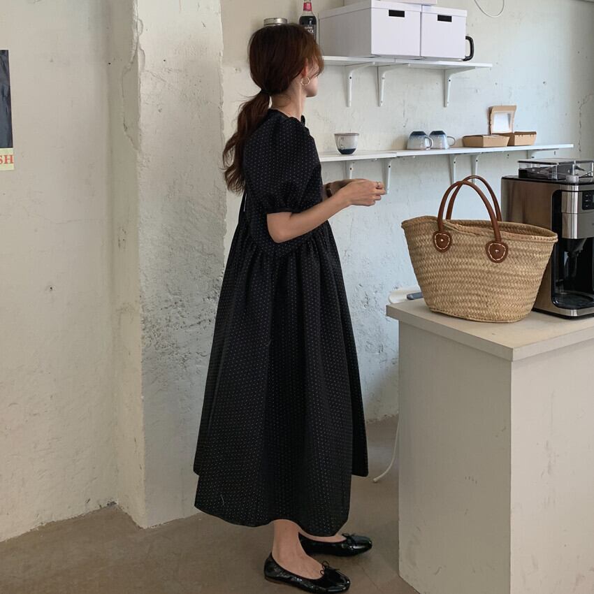 【送料無料】レディース 2カラー ワンピース ドット柄 パフスリーブ 膝下 ミモレ丈 ロング丈 半袖 ラウンドネック 襟なし バックリボン 切り替え ハイウエスト 大人可愛い ママコーデ ママファッション 韓国 オルチャンファッション 人気 トレンド 新作 20代 30代 40代 きれいめ レトロ シンプル お出かけ デート おしゃれ 通勤 通学 オフィス OL デイリー 普段着 ラフ カジュアル フェミニン シック ゆったり 体型カバー 着痩せ 着回し インスタ映え 春 夏 CO3553