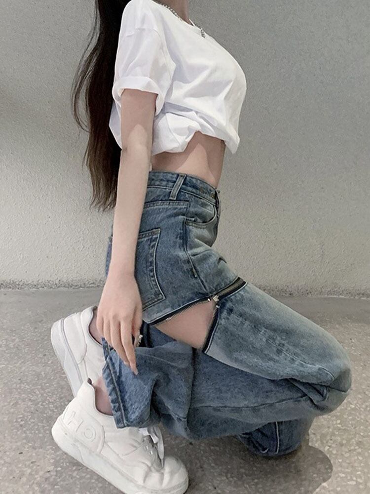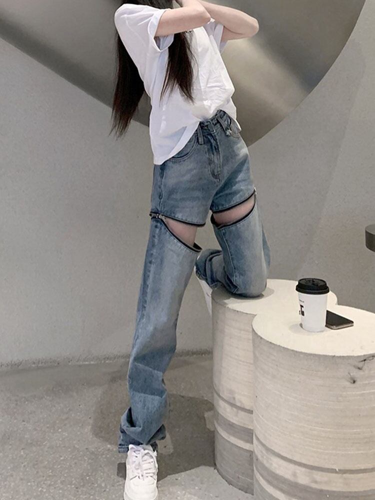 レディース デニムパンツ ファスナーデザイン カットアウト風 ストレートデニム 肌見せ 韓国ストリートファッション 人気 トレンド 新作 20代 30代 40代 シンプル お出かけ 普段着 ラフ カジュアル ゆったり 体型カバー 着痩せ 着回し 春 夏 秋 冬 CO3554