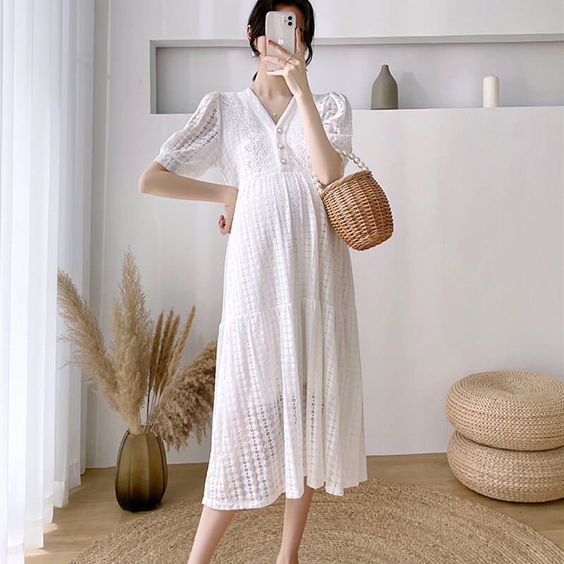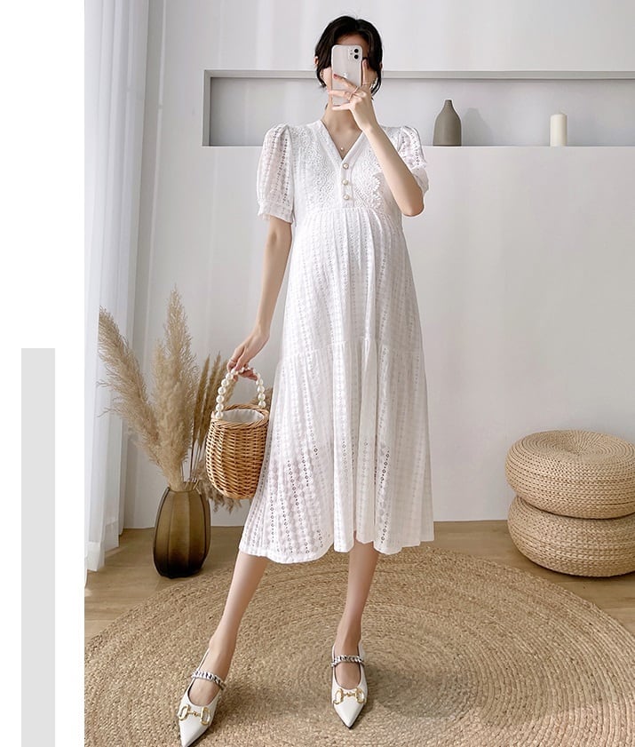 【日本未発売/送料無料】マタニティ ワンピース レース シースルー 透け感 Vネック パフスリーブ 半袖 Aライン フレア レディース 可愛い ママコーデ ママファッション ママ服 マタニティウェア 人気 ゆったり 大きいサイズ デイリー 普段着 お出かけ おしゃれ シンプル 無地 きれいめ カジュアル フェミニン シック 体型カバー 着痩せ 着回し お宮参り マタニティフォト 通勤 妊婦服 産前 産後 春 夏 CO3327