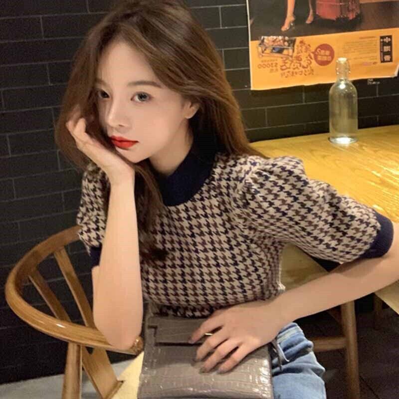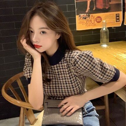【送料無料】レディース ニット トップス パフスリーブ 千鳥格子柄 ショート丈 半袖 大人可愛い ママコーデ ママファッション 韓国 オルチャンファッション 人気 トレンド 新作 20代 30代 40代 きれいめ レトロ シンプル お出かけ デート おしゃれ 通勤 通学 オフィス OL デイリー 普段着 ラフ カジュアル フェミニン シック ゆったり 体型カバー 着痩せ 着回し インスタ映え 春 秋 CO3571