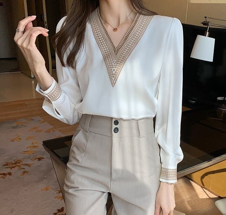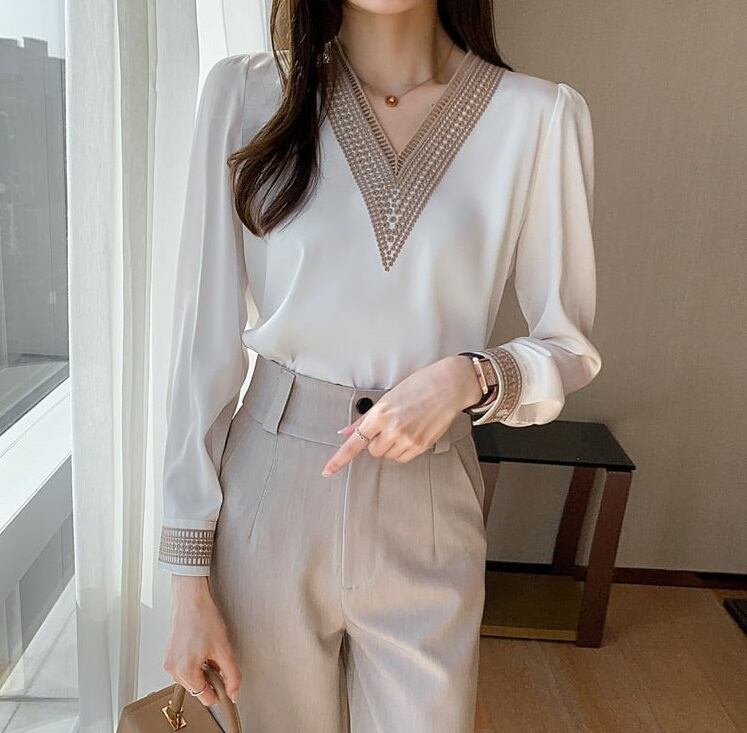 【送料無料】レディース シャツ ブラウス Vネック サテン 刺しゅう 長袖 ホワイト フォーマル 大人可愛い ママコーデ ママファッション 韓国 オルチャンファッション 人気 トレンド 新作 20代 30代 40代 きれいめ レトロ シンプル 無地 定番 お出かけ デート おしゃれ 通勤 通学 オフィス OL デイリー 普段着 ラフ カジュアル フェミニン シック ゆったり 体型カバー 着痩せ 着回し インスタ映え 秋 春 夏 CO3387
