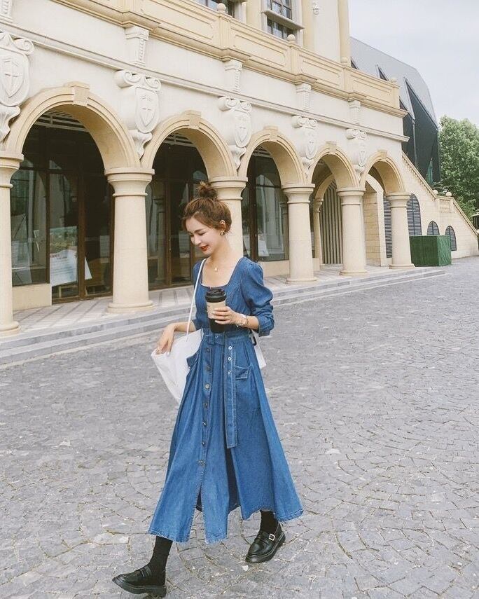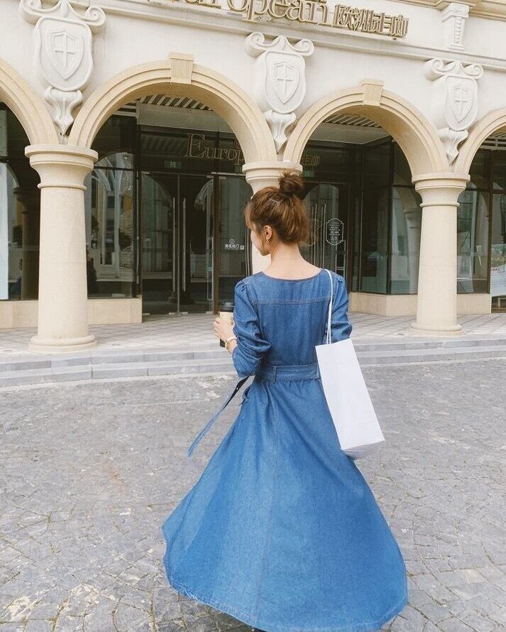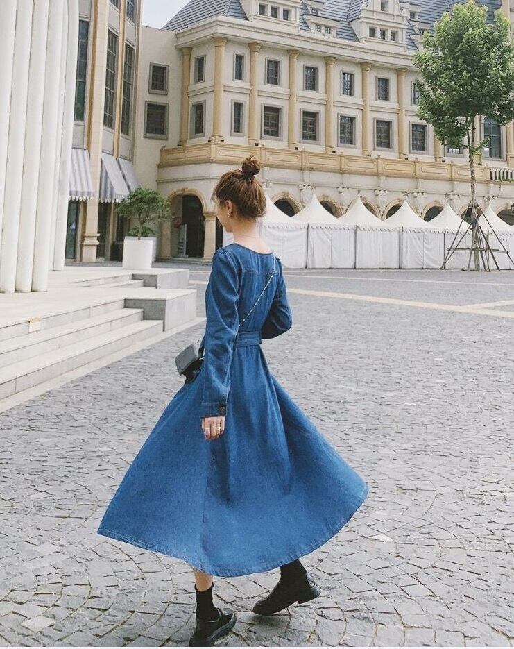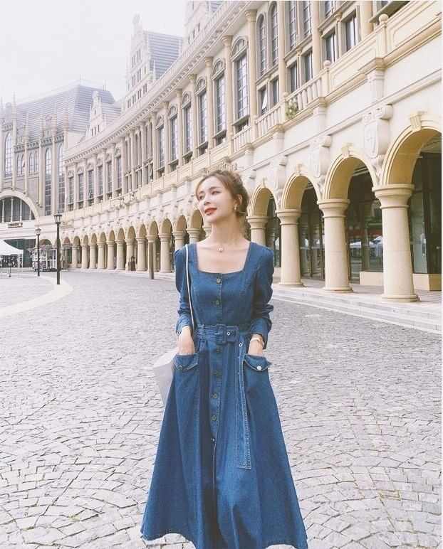 【送料無料】レディース デニムシャツワンピース スクエアネック ノーカラー ボタン フレア 長袖 ベルト ウエストマーク ロング丈 大人可愛い ママコーデ ママファッション 韓国 オルチャンファッション 人気 トレンド 新作 20代 30代 40代 きれいめ レトロ シンプル お出かけ デート おしゃれ 通勤 通学 オフィス OL デイリー 普段着 ラフ カジュアル フェミニン ゆったり 体型カバー 着痩せ 着回し インスタ映え 春 秋 冬 CO3584