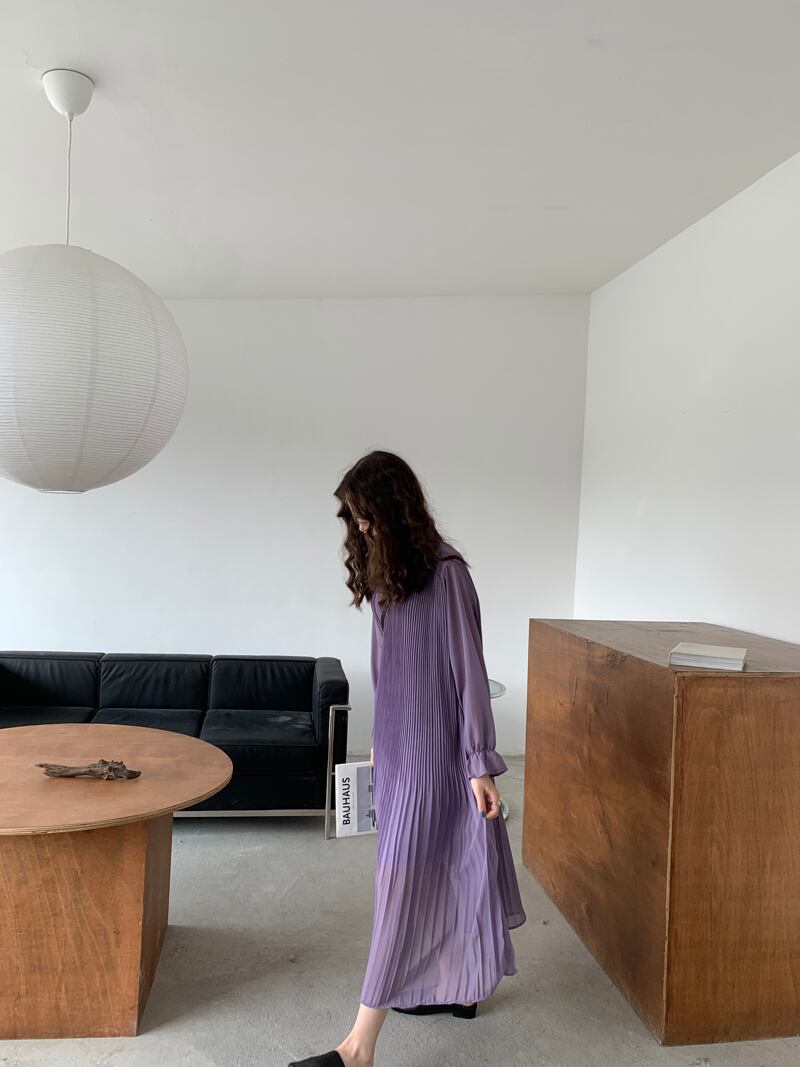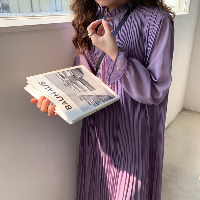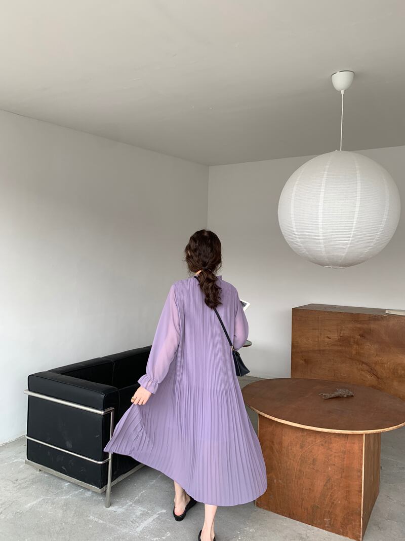 【送料無料】レディース ロングワンピース パープル ロング丈 プリーツ シフォン フレア袖 フリル スタンドカラー 長袖 裏地 大人可愛い ママコーデ ママファッション 韓国 オルチャンファッション 人気 トレンド 新作 20代 30代 40代 きれいめ レトロ シンプル お出かけ デート おしゃれ 通勤 通学 オフィス OL デイリー 普段着 ラフ カジュアル フェミニン シック ゆったり 体型カバー 着痩せ 着回し インスタ映え 春 秋 CO3585
