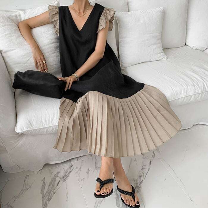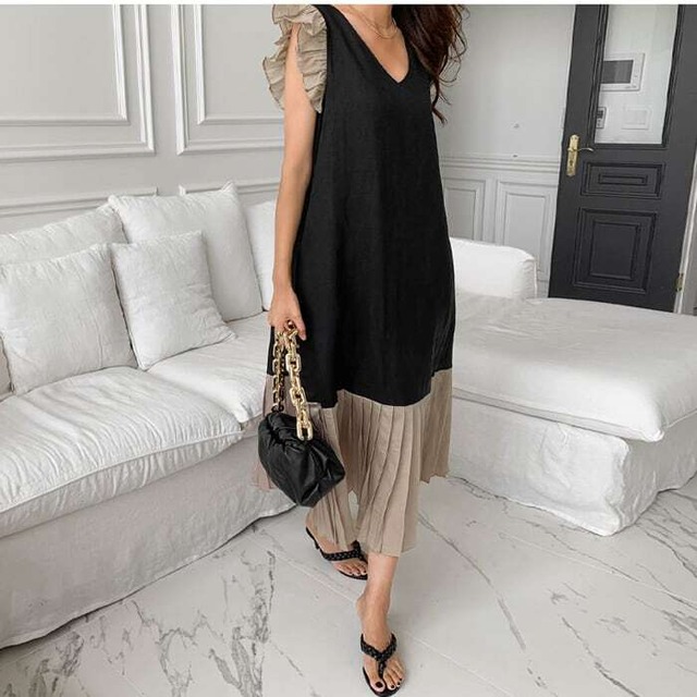 【送料無料】レディース ワンピース バイカラー ヘムプリーツ ロングワンピース フリル袖 切り替え Vネック 大人可愛い ママコーデ ママファッション 韓国 オルチャンファッション 人気 トレンド 新作 20代 30代 40代 きれいめ レトロ シンプル お出かけ デート おしゃれ 通勤 通学 オフィス OL デイリー 普段着 ラフ カジュアル フェミニン シック ゆったり 体型カバー 着痩せ 着回し インスタ映え 春 夏 秋 CO3591