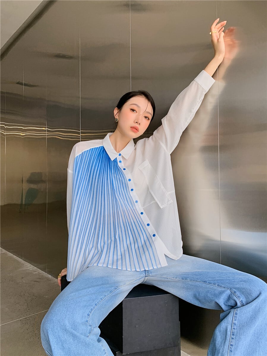 【送料無料】レディース シャツ 透け感 シアー 長袖 プリーツ アシンメトリー 大人可愛い ママコーデ ママファッション 韓国 オルチャンファッション 人気 トレンド 新作 20代 30代 40代 きれいめ レトロ シンプル お出かけ デート おしゃれ 通勤 通学 オフィス OL デイリー 普段着 ラフ カジュアル フェミニン シック ゆったり 体型カバー 着痩せ 着回し インスタ映え 春 夏 秋 CO3593