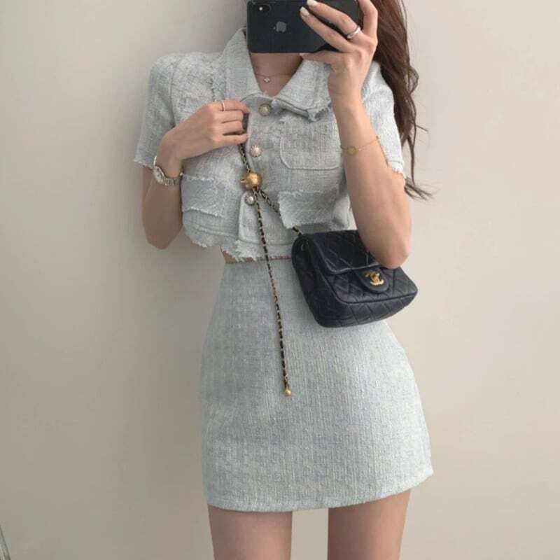 【送料無料】レディース セットアップ スーツ 半袖 ジャケット + スカート 2点セット 上下セット ミニ ショート丈 ツイード 大人可愛い ママコーデ ママファッション 韓国 オルチャンファッション 人気 トレンド 新作 20代 30代 40代 きれいめ レトロ シンプル 無地 定番 お出かけ デート おしゃれ 通勤 通学 オフィス OL デイリー 普段着 ラフ カジュアル フェミニン シック ゆったり 体型カバー 着痩せ 着回し インスタ映え 春 夏 CO3439