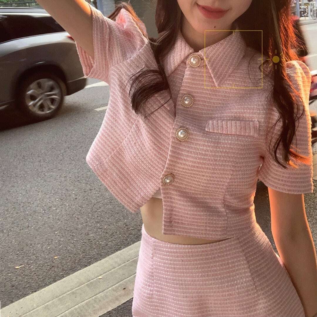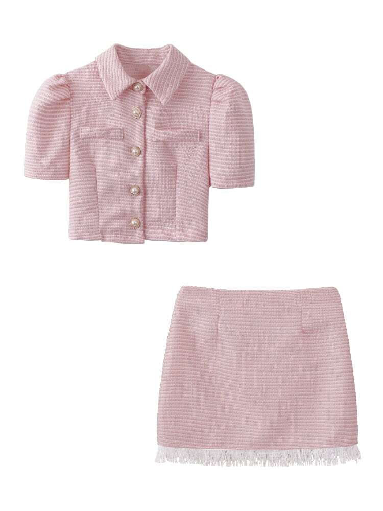 【送料無料】レディース セットアップ スーツ 半袖 ジャケット + スカート 2点セット 上下セット ミニ ショート丈 ツイード パールボタン フリンジ 大人可愛い ママコーデ ママファッション 韓国 オルチャンファッション 人気 トレンド 新作 20代 30代 40代 きれいめ レトロ シンプル 無地 定番 お出かけ デート おしゃれ 通勤 通学 オフィス OL デイリー 普段着 ラフ カジュアル フェミニン シック ゆったり 体型カバー 着痩せ 着回し インスタ映え 春 夏 CO3442