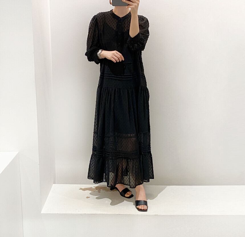 【送料無料】レディース 2カラー ワンピース ロングワンピース マキシワンピース ドット ラウンドネック 透け感 切り替え フリル 大人可愛い ママコーデ ママファッション 韓国 オルチャンファッション 人気 トレンド 新作 20代 30代 40代 きれいめ レトロ シンプル お出かけ デート おしゃれ 通勤 通学 オフィス OL デイリー 普段着 ラフ カジュアル フェミニン シック ゆったり 体型カバー 着痩せ 着回し インスタ映え 春 秋 CO3547