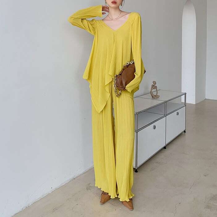 【送料無料】レディース セットアップ プルオーバー トップス Vネック アシンメトリー パンツ プリーツ ワイドパンツ 上下セット 大人可愛い ママコーデ ママファッション 韓国系 オルチャンファッション 人気 トレンド 新作 20代 30代 40代 きれいめ レトロ シンプル お出かけ デート おしゃれ 通勤 通学 オフィス OL デイリー 普段着 ラフ カジュアル フェミニン シック ゆったり 体型カバー 着痩せ 着回し インスタ映え 春 夏 秋 CO3748