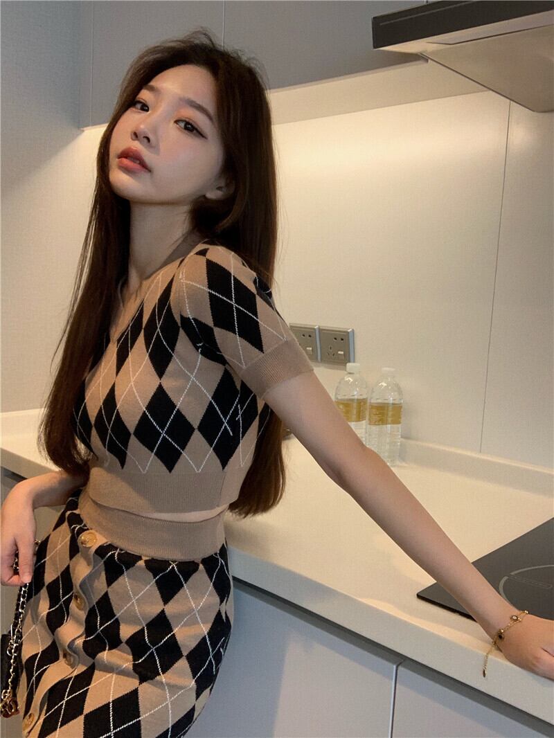 【送料無料】レディース セットアップ ニット ショート丈 Vネック 半袖 ミニスカート タイト ボタン アーガイル柄 大人可愛い ママコーデ ママファッション 韓国系 オルチャンファッション 人気 トレンド 新作 20代 30代 40代 きれいめ レトロ シンプル お出かけ デート おしゃれ 通勤 通学 オフィス OL デイリー 普段着 ラフ カジュアル フェミニン シック ゆったり 体型カバー 着痩せ 着回し インスタ映え 春 夏 CO3751