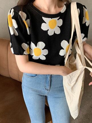 【送料無料】レディース ニット トップス 半袖 パフスリーブ フラワー 花柄 ブラック 大人可愛い ママコーデ ママファッション 韓国系 オルチャンファッション 人気 トレンド 新作 20代 30代 40代 きれいめ レトロ シンプル お出かけ デート おしゃれ 通勤 通学 オフィス OL デイリー 普段着 ラフ カジュアル フェミニン シック ゆったり 体型カバー 着痩せ 着回し インスタ映え 春 夏 CO3755