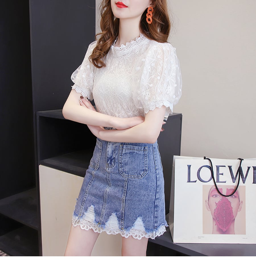 【送料無料】レディース セットアップ ブラウス プルオーバー スタンドカラー シアー 花柄 ドット パフスリーブ レース フリル 半袖 スカート ミニ丈 デニム 裾フリル ダメージ 大人可愛い ママコーデ ママファッション 韓国系 オルチャンファッション 人気 トレンド 新作 20代 30代 40代 きれいめ レトロ シンプル お出かけ デート おしゃれ 通勤 通学 オフィス OL デイリー 普段着 ラフ カジュアル フェミニン シック 着痩せ 着回し インスタ映え 春 夏 CO3791