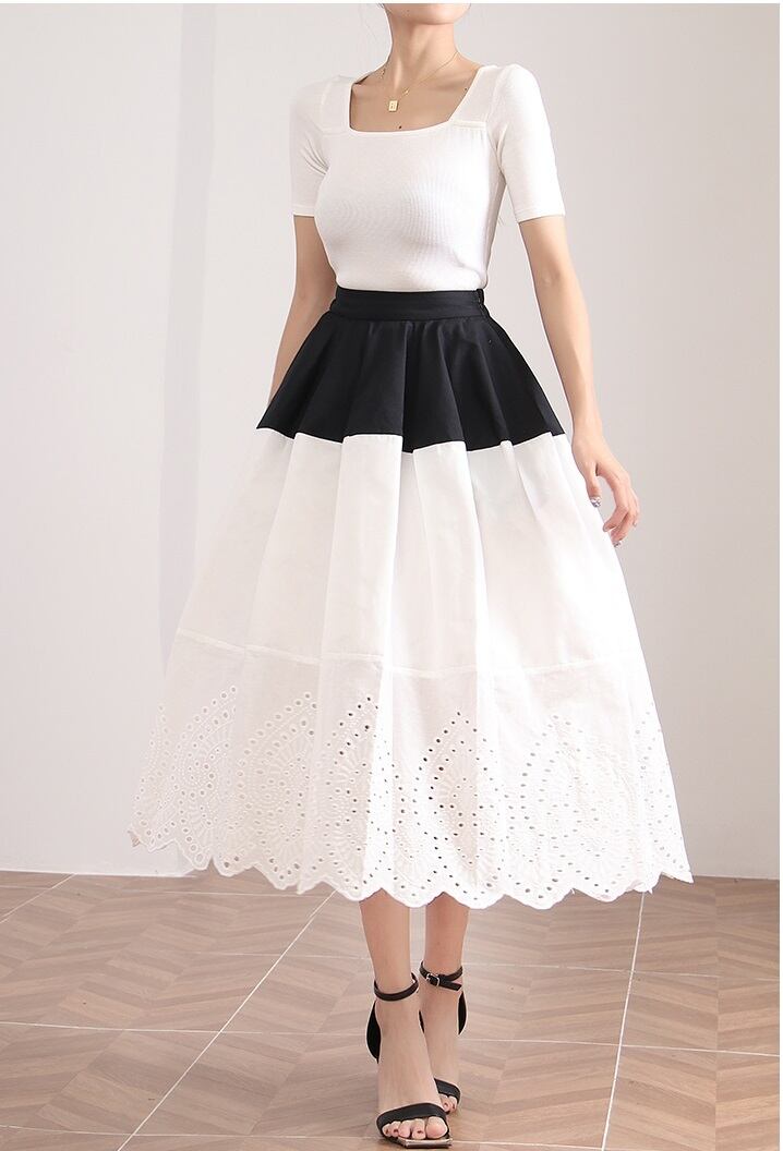 【送料無料】レディース スカート バイカラー コットン ボリューム フレア ミモレ丈 レース 大人可愛い ママコーデ ママファッション 韓国系 オルチャンファッション 人気 トレンド 新作 20代 30代 40代 きれいめ レトロ シンプル お出かけ デート おしゃれ 通勤 通学 オフィス OL デイリー 普段着 ラフ カジュアル フェミニン シック ゆったり 体型カバー 着痩せ 着回し インスタ映え 春 夏 CO3802