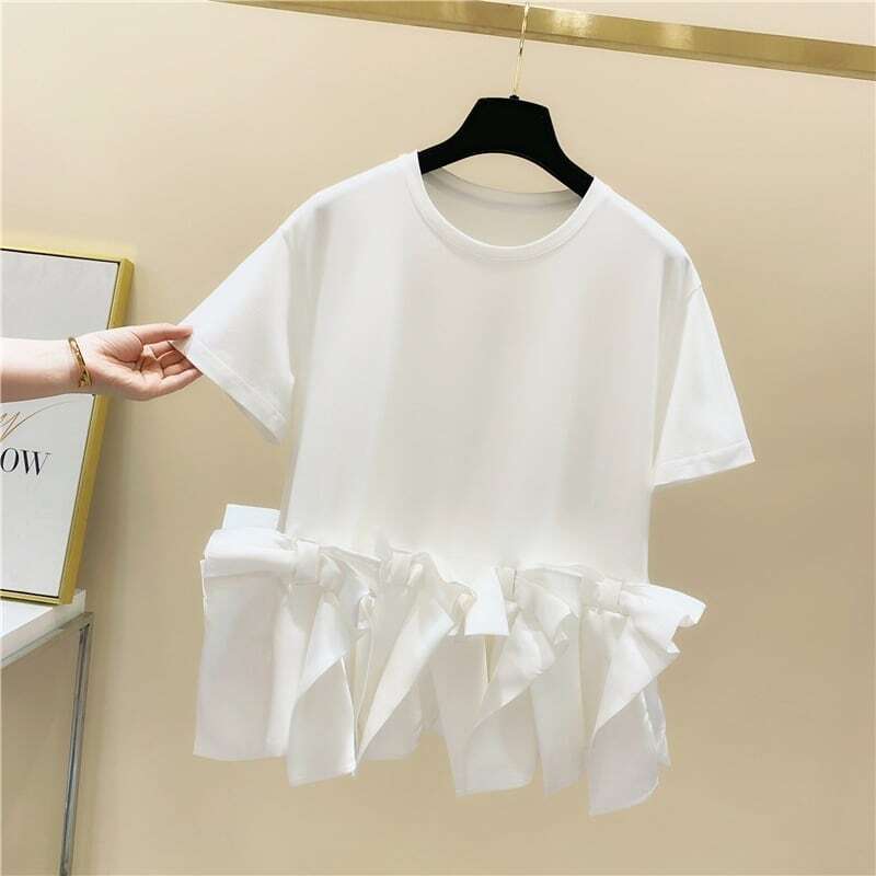 裾のリボンプリーツでカジュアルなTシャツが大人可愛く◎