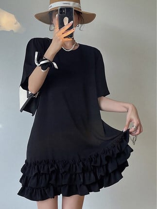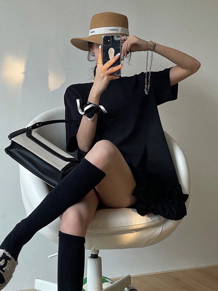 【送料無料】レディース ワンピース Tシャツワンピース 半袖 フリル ミニワンピース ミニ丈 ブラック 黒 大人可愛い ママコーデ ママファッション 韓国系 オルチャンファッション 人気 トレンド 新作 20代 30代 40代 きれいめ レトロ シンプル お出かけ デート おしゃれ 通勤 通学 オフィス OL デイリー 普段着 ラフ カジュアル フェミニン シック ゆったり 体型カバー 着痩せ 着回し インスタ映え 春 夏 CO3829