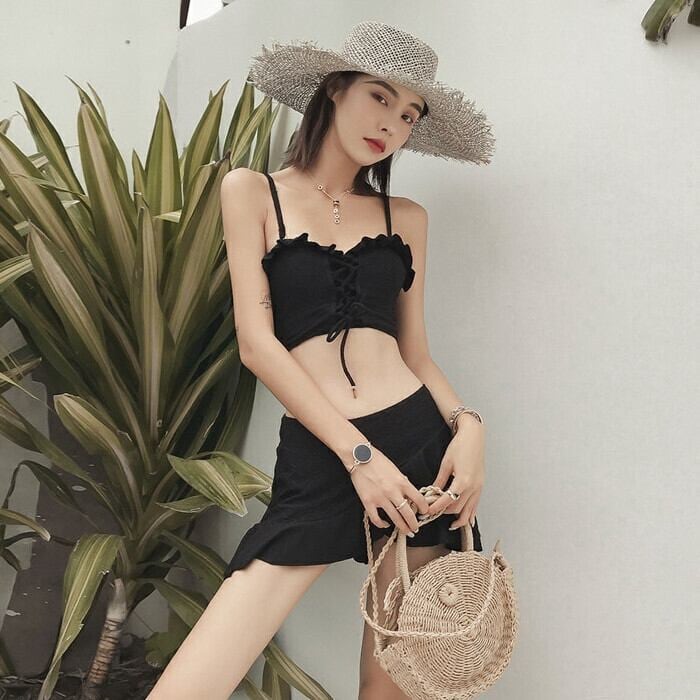 【送料無料】レディース セパレート 水着 3点セット ブラック ホワイト 地模様 フリル 編み上げリボン アシンメトリー スカート 大人可愛い ママコーデ ママファッション 韓国 オルチャンファッション 人気 トレンド 新作 20代 30代 40代 スイムウェア 体型カバー ハイウエスト ビキニ バンドゥ タンキニ ショートスカート 大きいサイズ 可愛い ぽっちゃり パレオ パッド付き 小胸 UVカット カジュアル フェミニン セクシー リゾート 旅行 海 プール ママ水着 海水浴 夏 CO3658