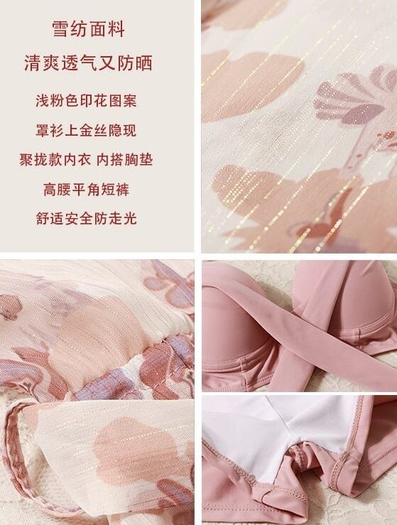 ふんわり透け感ある素材にブラウスが付いた、フェミニンなビキニ3点セット。