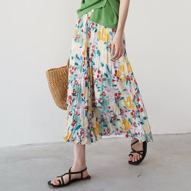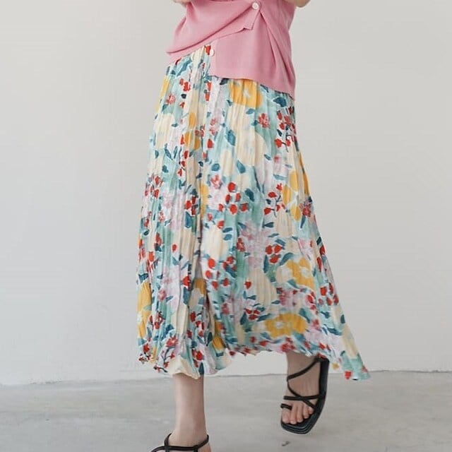 ビビッドなフラワーパターンで華やかに演出するプリーツスカート。