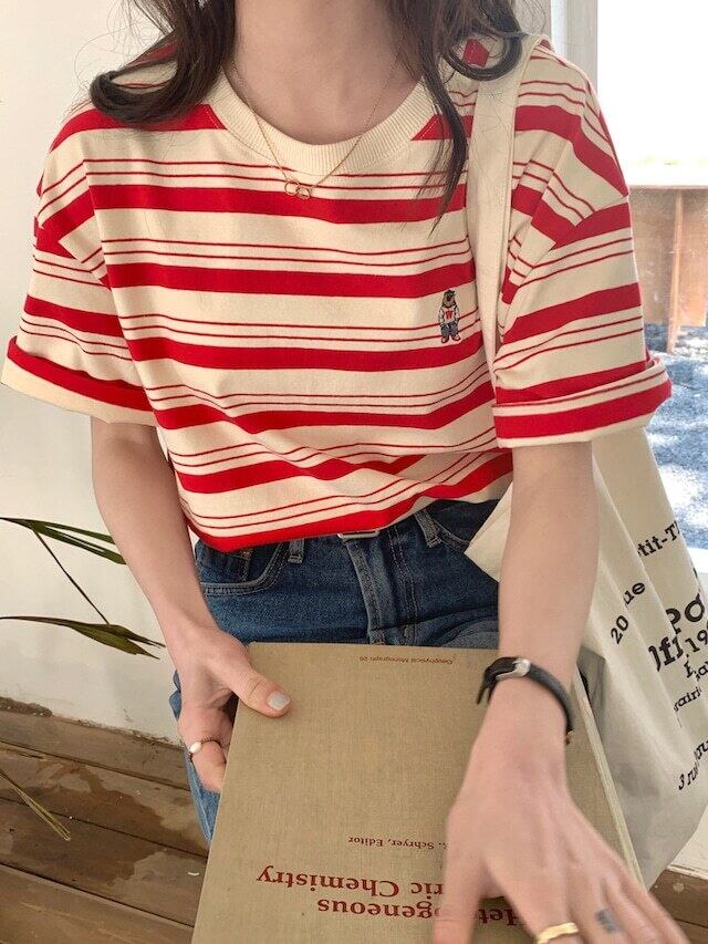【送料無料】レディース ベア刺繍ボーダー シャツ トップス Tシャツ ラウンドネック プルオーバー 半袖 大人可愛い ママコーデ ママファッション 韓国系 オルチャン 人気 トレンド 新作 20代 30代 40代 きれいめ レトロ シンプル お出かけ デート おしゃれ 通勤 通学 オフィス OL デイリー 普段着 ラフ カジュアル フェミニン シック ゆったり 体型カバー 着痩せ 着回し インスタ映え 春 夏 CO3965