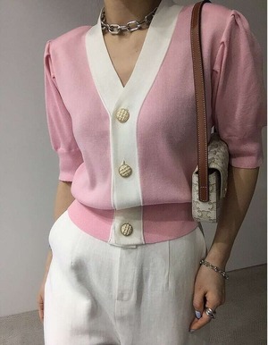 大きめボタンとバイカラーが印象的な半袖ニットカーディガン。