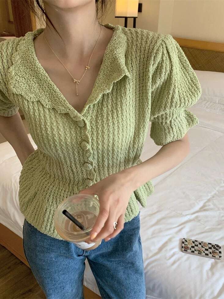 【送料無料】レディース ニット セーター パフスリーブ Vネット くるみボタン 襟付き カーディガン 大人可愛い ママコーデ ママファッション 韓国系 オルチャン 人気 トレンド 新作 20代 30代 40代 きれいめ レトロ シンプル お出かけ デート おしゃれ 通勤 通学 オフィス OL デイリー 普段着 ラフ カジュアル フェミニン シック ゆったり 体型カバー 着痩せ 着回し インスタ映え 春 夏 CO3982