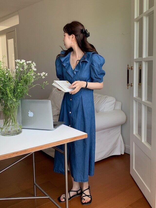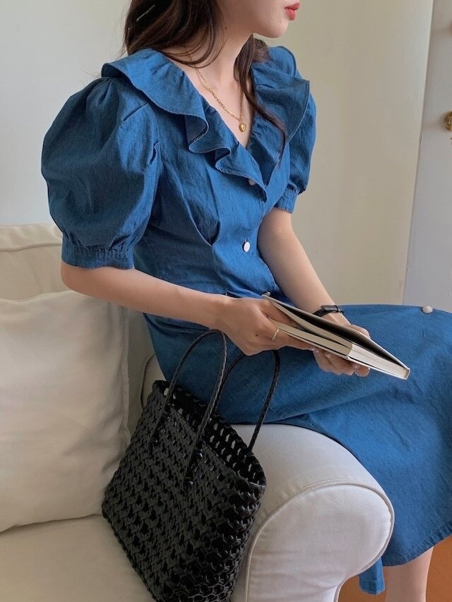 【送料無料】レディース デニム フリル ワンピース Vネック パフスリーブ ロング 大人可愛い ママコーデ ママファッション 韓国系 オルチャン 人気 トレンド 新作 20代 30代 40代 きれいめ レトロ シンプル お出かけ デート おしゃれ 通勤 通学 オフィス OL デイリー 普段着 ラフ カジュアル フェミニン シック ゆったり 体型カバー 着痩せ 着回し インスタ映え 春 夏 CO3994