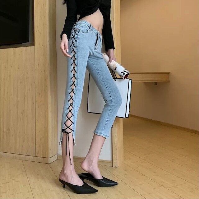 レディース レースアップ ハイウエスト ジーンズ 編み上げ スキニーパンツ スリム クロップドパンツ デニム ブルー 大人可愛い ママコーデ ママファッション 韓国系 オルチャン 人気 トレンド 新作 20代 30代 40代 きれいめ レトロ シンプル お出かけ デート おしゃれ 通勤 通学 オフィス OL デイリー 普段着 ラフ カジュアル フェミニン シック ゆったり 体型カバー 着痩せ 着回し インスタ映え 春 夏 CO4012