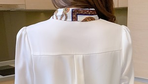 ボウタイのスカーフ柄で華やかさと、アクセントをプラスし