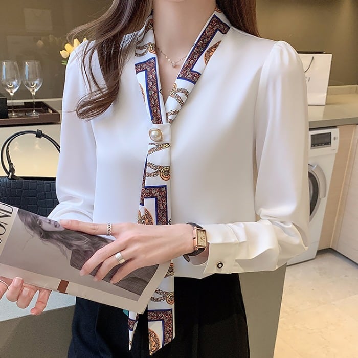 【送料無料】レディース スカーフ ボウタイ ブラウス Vネック 長袖 2color 大人可愛い ママコーデ ママファッション 韓国系 オルチャン 人気 トレンド 新作 20代 30代 40代 きれいめ レトロ シンプル お出かけ デート おしゃれ 通勤 通学 オフィス OL デイリー 普段着 ラフ カジュアル フェミニン シック ゆったり 体型カバー 着痩せ 着回し インスタ映え 春 夏 CO4025
