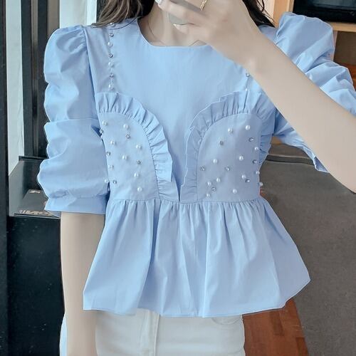 【送料無料】レディース トップス フリルトリム パールデザイン ペプラム ブラウス 大人可愛い ママコーデ ママファッション 韓国系 オルチャン 人気 トレンド 新作 20代 30代 40代 きれいめ レトロ シンプル お出かけ デート おしゃれ 通勤 通学 オフィス OL デイリー 普段着 ラフ カジュアル フェミニン シック ゆったり 体型カバー 着痩せ 着回し インスタ映え 春 夏 CO4059