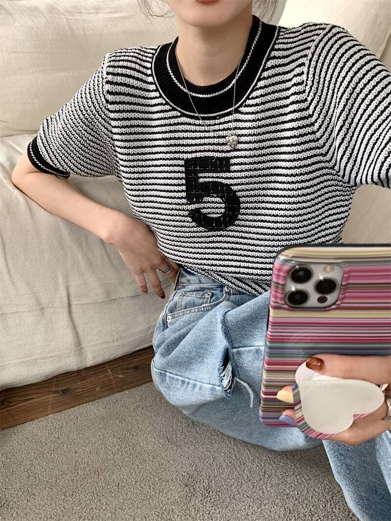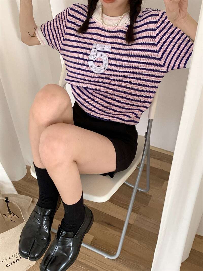 【送料無料】レディース ナンバー ボーダー ピンク ニット ラウンドネック 半袖 トップス 大人可愛い ママコーデ ママファッション 韓国系 オルチャン 人気 トレンド 新作 20代 30代 40代 きれいめ レトロ シンプル お出かけ デート おしゃれ 通勤 通学 オフィス OL デイリー 普段着 ラフ カジュアル フェミニン シック ゆったり 体型カバー 着痩せ 着回し インスタ映え 春 夏 CO4074