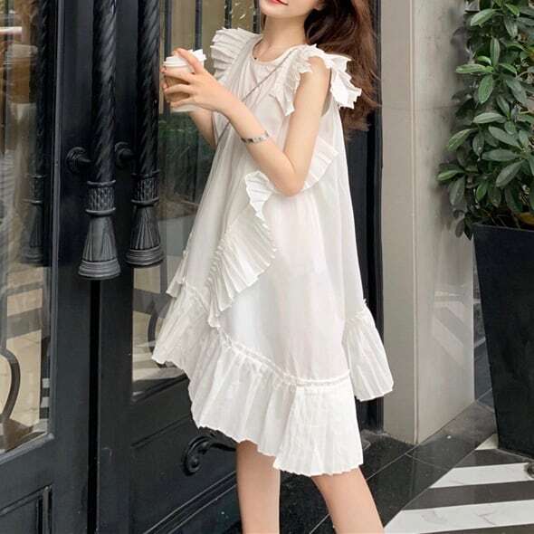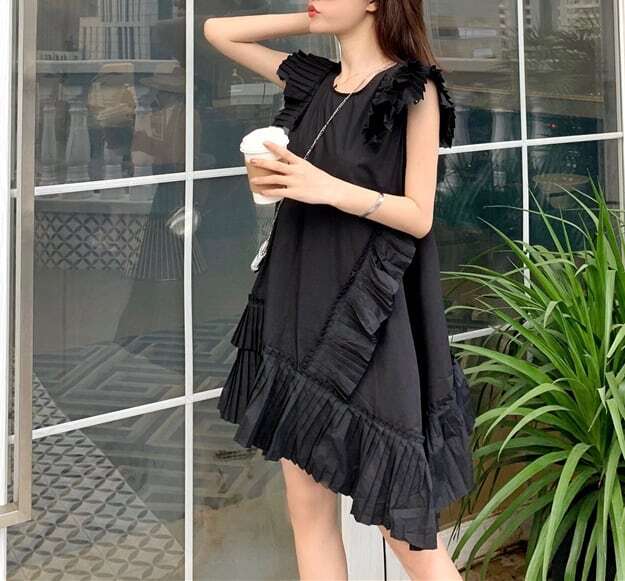 【送料無料】レディース 全2色 フリル アシンメトリー ワンピース ノースリーブ Aライン プリーツ 大人可愛い ママコーデ ママファッション 韓国系 オルチャン 人気 トレンド 新作 20代 30代 40代 きれいめ レトロ シンプル お出かけ デート おしゃれ 通勤 通学 オフィス OL デイリー 普段着 ラフ カジュアル フェミニン シック ゆったり 体型カバー 着痩せ 着回し インスタ映え 春 夏 CO4079