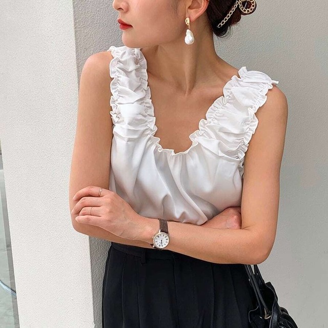 上品なフリルが華奢な腕周りを演出するノースリーブブラウス。