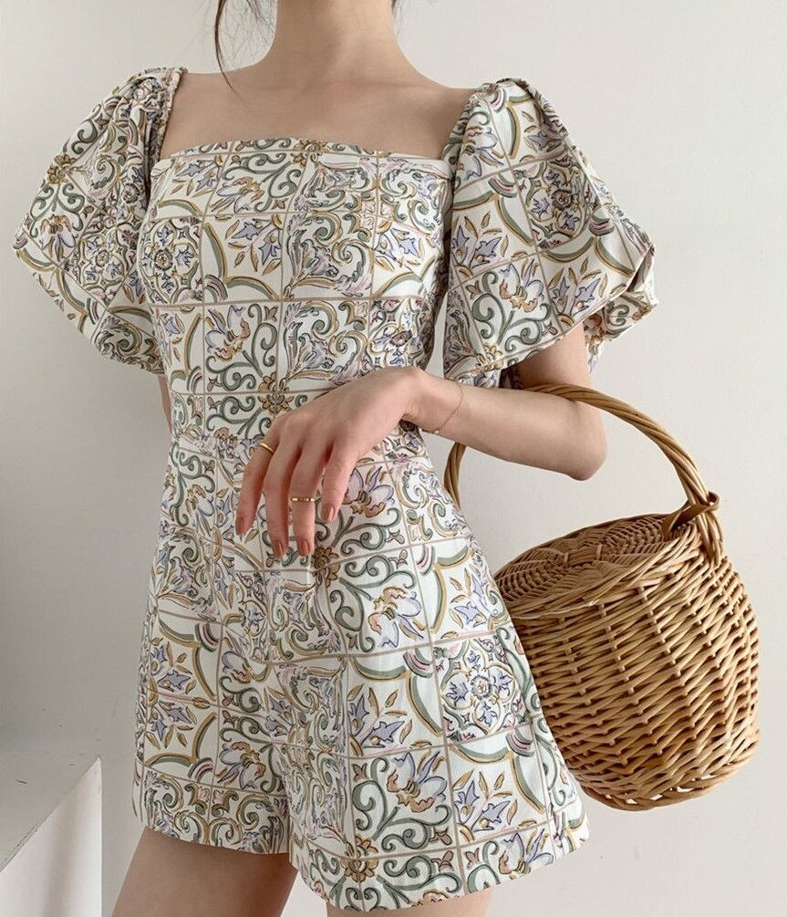 【送料無料】レディース サロペット ロンパース ボリューム袖 プリント柄 ショート丈 オールインワン キュロット 大人可愛い ママコーデ ママファッション 韓国系 オルチャン 人気 トレンド 新作 20代 30代 40代 きれいめ レトロ シンプル お出かけ デート おしゃれ 通勤 通学 オフィス OL デイリー 普段着 ラフ カジュアル フェミニン シック ゆったり 体型カバー 着痩せ 着回し インスタ映え 春 夏 CO4175
