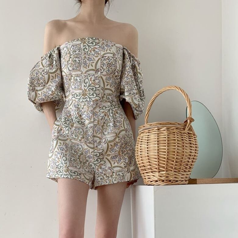 レトロ花柄がロマンティックな雰囲気を醸し出す、大人可愛いショートロンパース。
